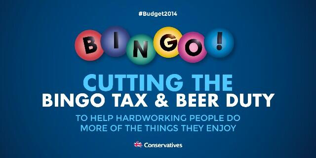 It's - I was astonished to discover - not a parody. It's real. Not a parody. A real image produced by the Conservatives to publicise the benefits of their recent budget to 'hardworking people'. As you can see from the poster, this amounts to reducing the cost of bingo and beer.